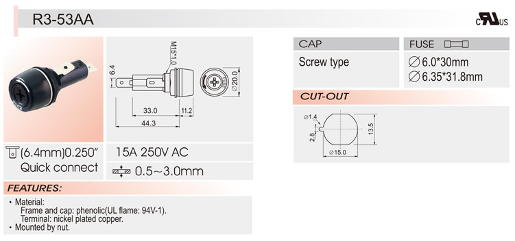 6*30面板安裝保險(xiǎn)絲座 R3-53 UL  CSA 15A250V