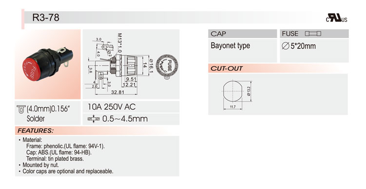 5*20面板安裝保險絲座 R3-78 UL CSA 10A250V